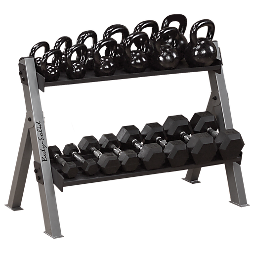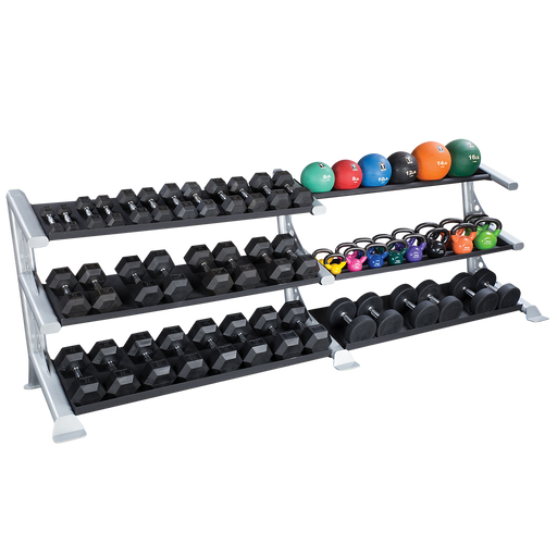 View full detailsBody-Solid's commercial-rated simple, sturdy dumbbell rack. Our most common rack we sell, this rack with two tiers will fit one set of 5 to 50 hex dumbbells, and with the third tier, will fit up to 70lb sets of hex dumbbells. This rack is a modu...