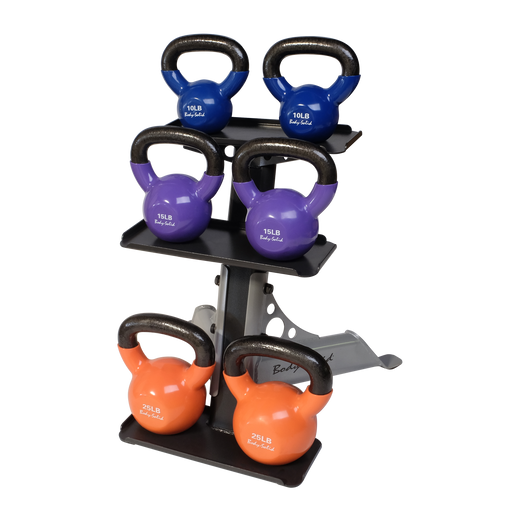View full detailsStore any 6 kettlebells, all the way up to 50lbs, safely and in a small footprint with this rack. Offset shelves allow for easy access to each kettlebell, and fits perfectly in any small home gym. 20”W x 19”D x 21”H 19 Lbs 3 offset tiers for ea...