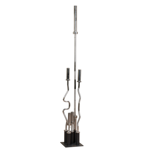 View full detailsA simple, sturdy way to hold 5 bars at a time in an upright position. Great for the powerlifters who collect different types of bars at the behest of their spouses. Coated in a satin black powder finish and holds bars with 2" diameter sleeves. You...