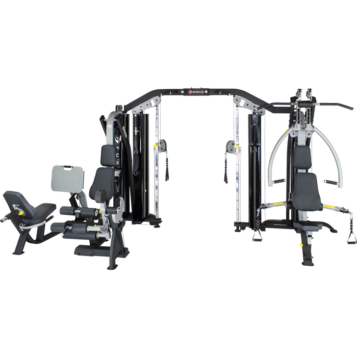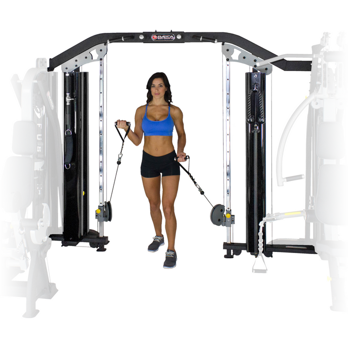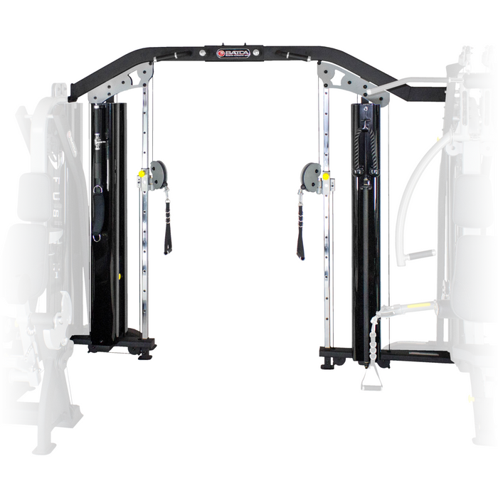 The Batca Fusion System also includes the FZ-5 Functional Trainer, which offers adjustable dual pulleys for limitless free cable exercises and adjustable dual high/low swivel pulleys for bar exercises. The FZ-5 also features chin-up bars with wide and neutral grips and optional FZ-2 cable arms, providing additional exercise options.