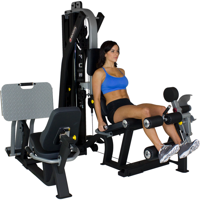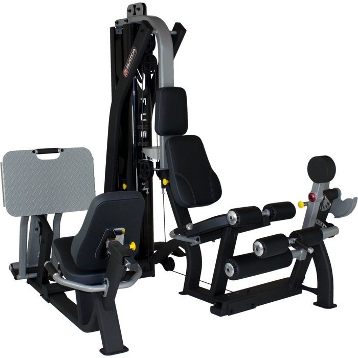 The Batca Fusion System includes several units, such as the FZ-1 Upper Body Unit, which features dual swiveling high pulleys and multi-press arms, allowing users to perform various exercises, including chest press, incline/decline press, and chest-supported mid-row. The FZ-3 Lower Body Unit offers seated leg curl/leg extension with patented knee alignment pads, contoured and telescoping back pad, eight starting point adjustments, and a counterbalanced exercise arm. The FZ-4 Leg Press/Calf Raise Unit has a walkthrough frame design, a large footplate, and a four-bar linkage with a 2:1 weight ratio.