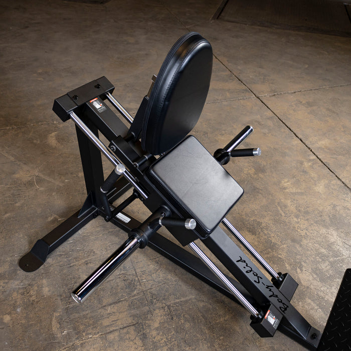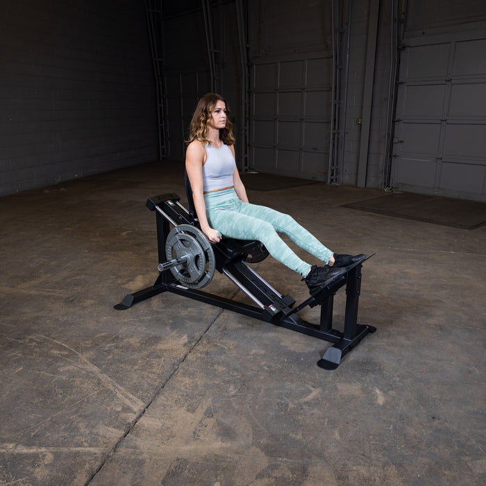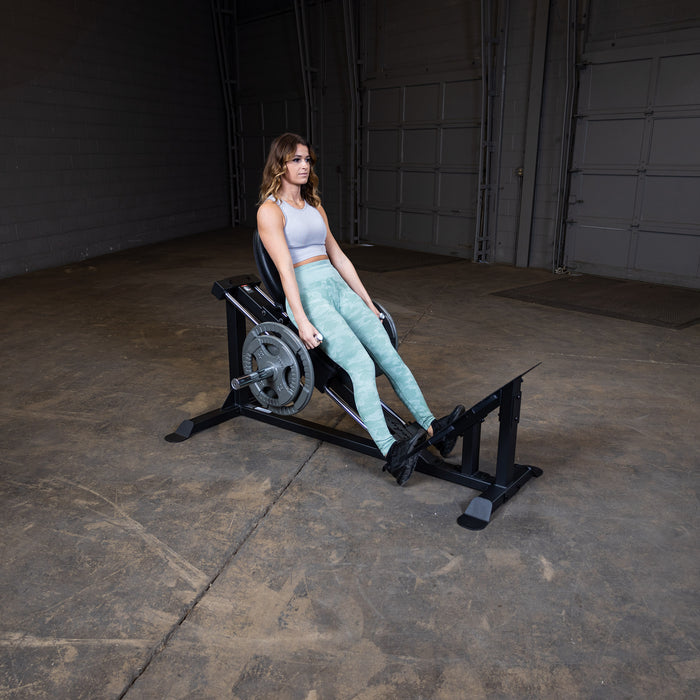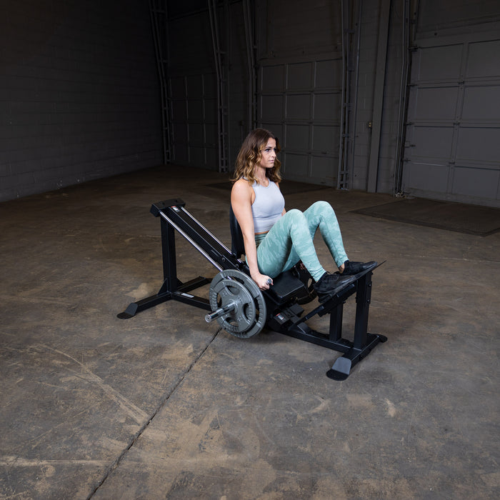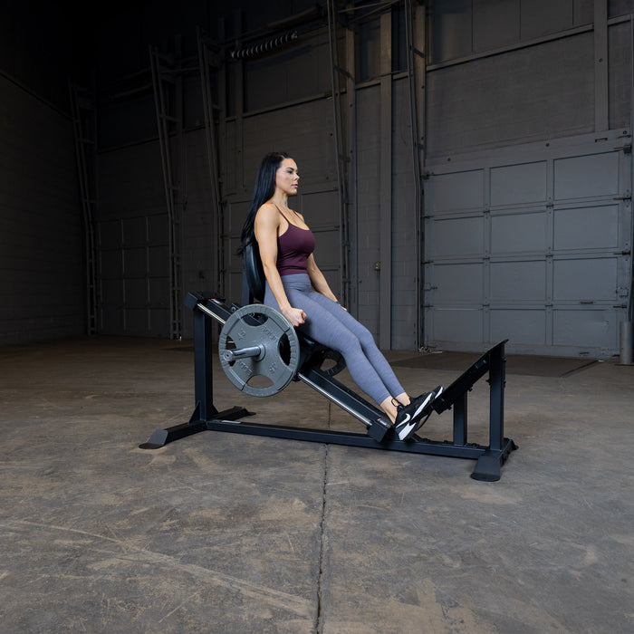 The GCLP100 combines two great movements—leg press and calf raise—into one compact, safe and easy-to-use machine. Measuring at just 47.2” wide and 67.1” deep, the GCLP100 is one of the most compact, functional leg press machines on the market and can easily fit into most facilities and homes with ease. Don’t let the compact size fool you, like a high-end sports car, the Body-Solid GCLP100 is built to perform. The best-in-class carriage glides on sealed linear ball bearings and case-hardened, chrome-plated guide rods for unprecedented smoothness even at heavy weights. Heavy-gauge steel construction ensures a lifetime of reliability, even in heavy-use facilities. Fully-adjustable, the GCLP100 allows any user to find the perfect fit while the hand grips lock the user into position, avoiding stress on the lower back. Two 12” chrome-plated weight horns allow users to comfortably add weight to the GCLP100 up to the 1,000 lb. weight capacity. Plates not included..