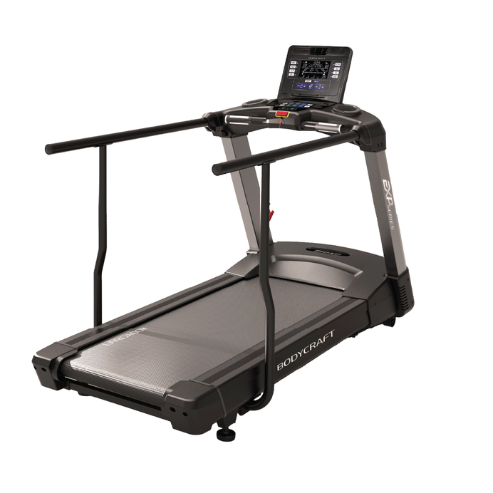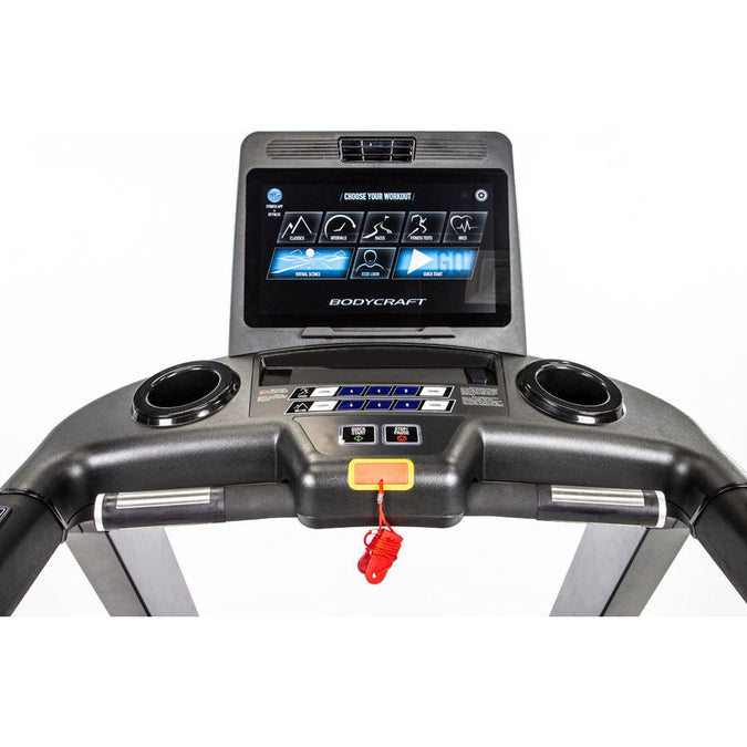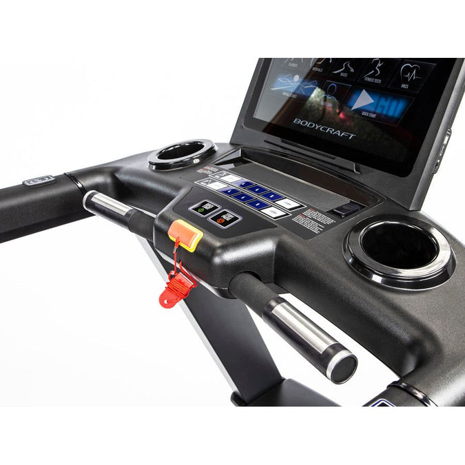 The BODYCRAFT T1050 Treadmill is designed for commercial use and can accommodate users up to 500 lbs. It features a durable 5.0 HP AC Motor, a maintenance-free EVERLAST BELT, and a large running surface. Optional interchangeable consoles offer entertainment and fitness apps, such as Netflix and Zwift, making workouts engaging and tailored to individual preferences.
