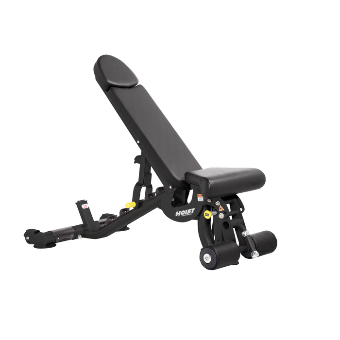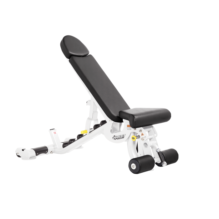 - Seven back pad positions adjust from -15°, 0°, 15°, 30°, 45°, 60° and 80° to accommodate flat, incline and decline bench exercises