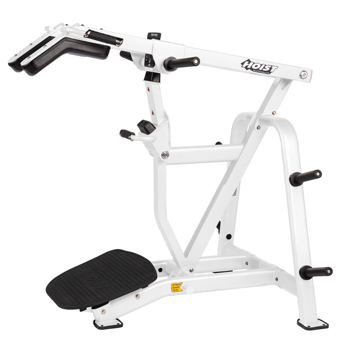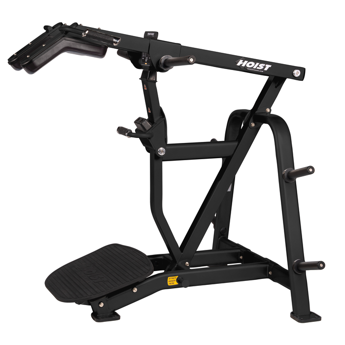 The HOIST® Power Squat is designed to do exactly what it is named for… to build muscle, add mass and increase power to the lower body – including glutes, thighs, calves and lower back. An ergonomically correct pad and large footplate provides stability and helps position users correctly while ensuring the best squat exercise experience possible. An intuitive, easy-to-use lockout system helps keep users safe, and the sealed ball-bearing pivot makes for a smooth and quiet motion. Pegs for adding resistance bands are built-in on both sides of the machine. High Impact Polypropylene covered weight horns protect the frame and reduce noise. The Power Squat’s space saving, upright design takes up a minimum footprint in your gym or workout facility.